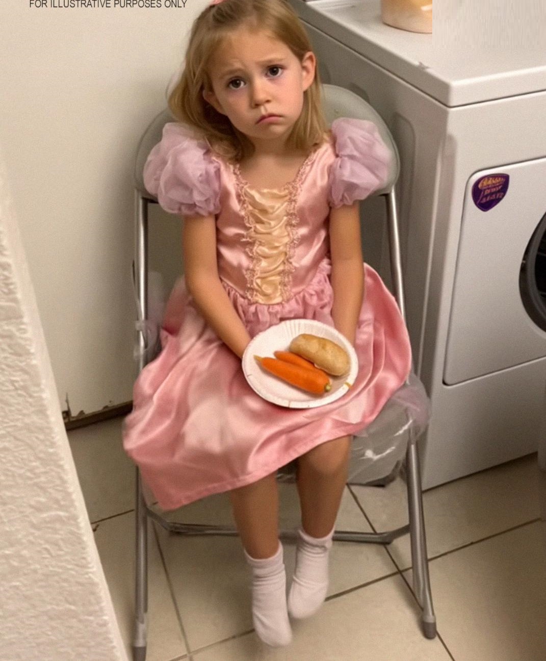 Inside the laundry room, between a basket of dirty towels and a humming dryer, sat a metal folding chair. Ivy sat quietly on it, holding a flimsy paper plate with two baby carrots and a dinner roll.