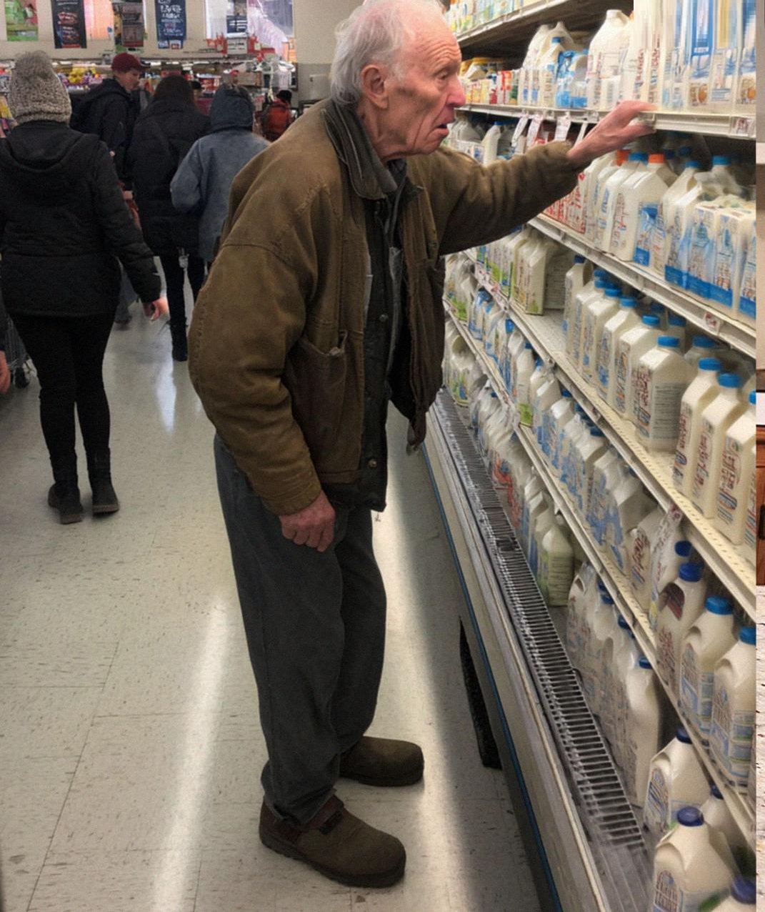 I was pushing my mop down the dairy aisle when I spotted an old man staring at the milk like it held the secrets of the universe. His coat was patched and threadbare, his shoes nearly falling apart, and in his basket was a small loaf of bread and a can of beans.