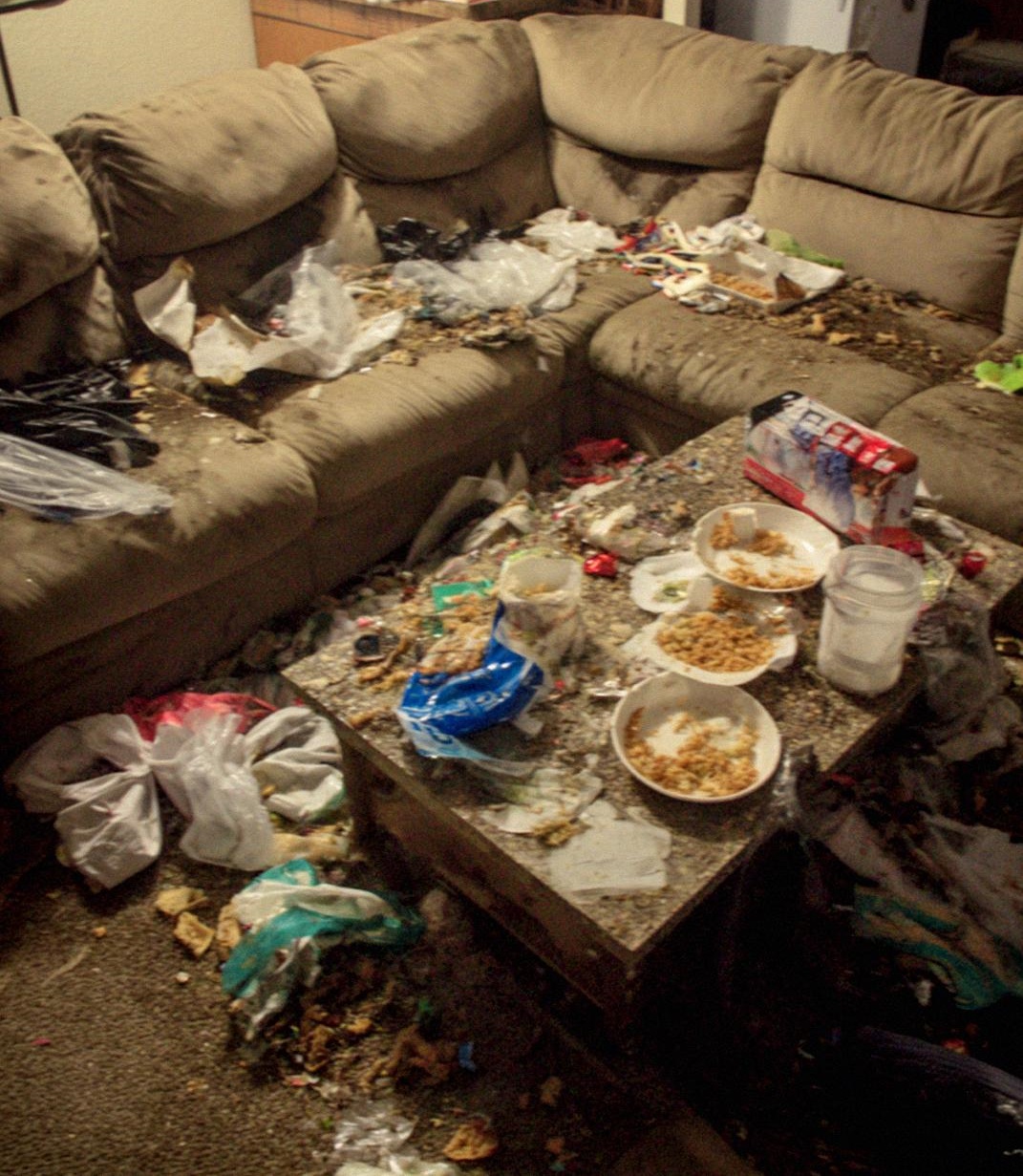 The counters were piled high with trash. There were paper plates, pizza crusts, greasy napkins, and half-empty bottles of orange soda. And of course, nothing had been bagged into trash bags. No one had even tried to clean up.