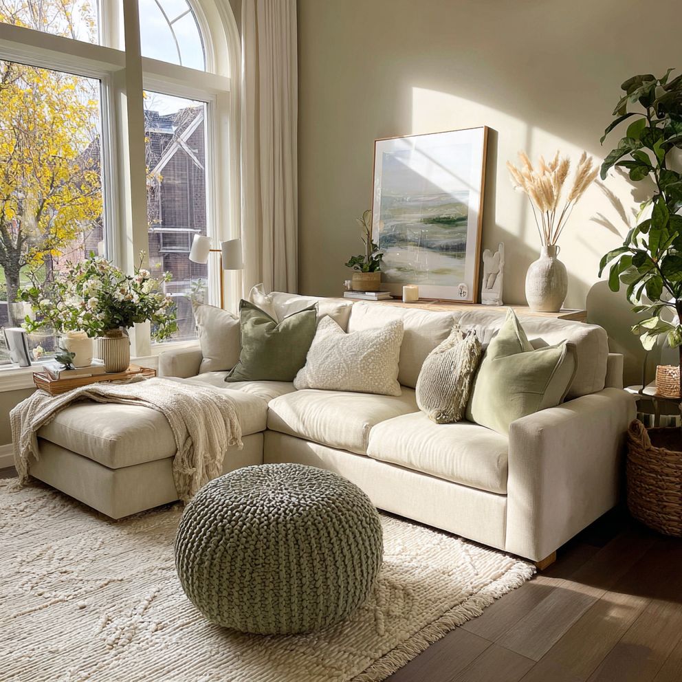 The living room is soft beige, with sage green accents I found in a fabric swatch and couldn’t get out of my head. The hallways are cream, catching the afternoon light like something out of a dream.