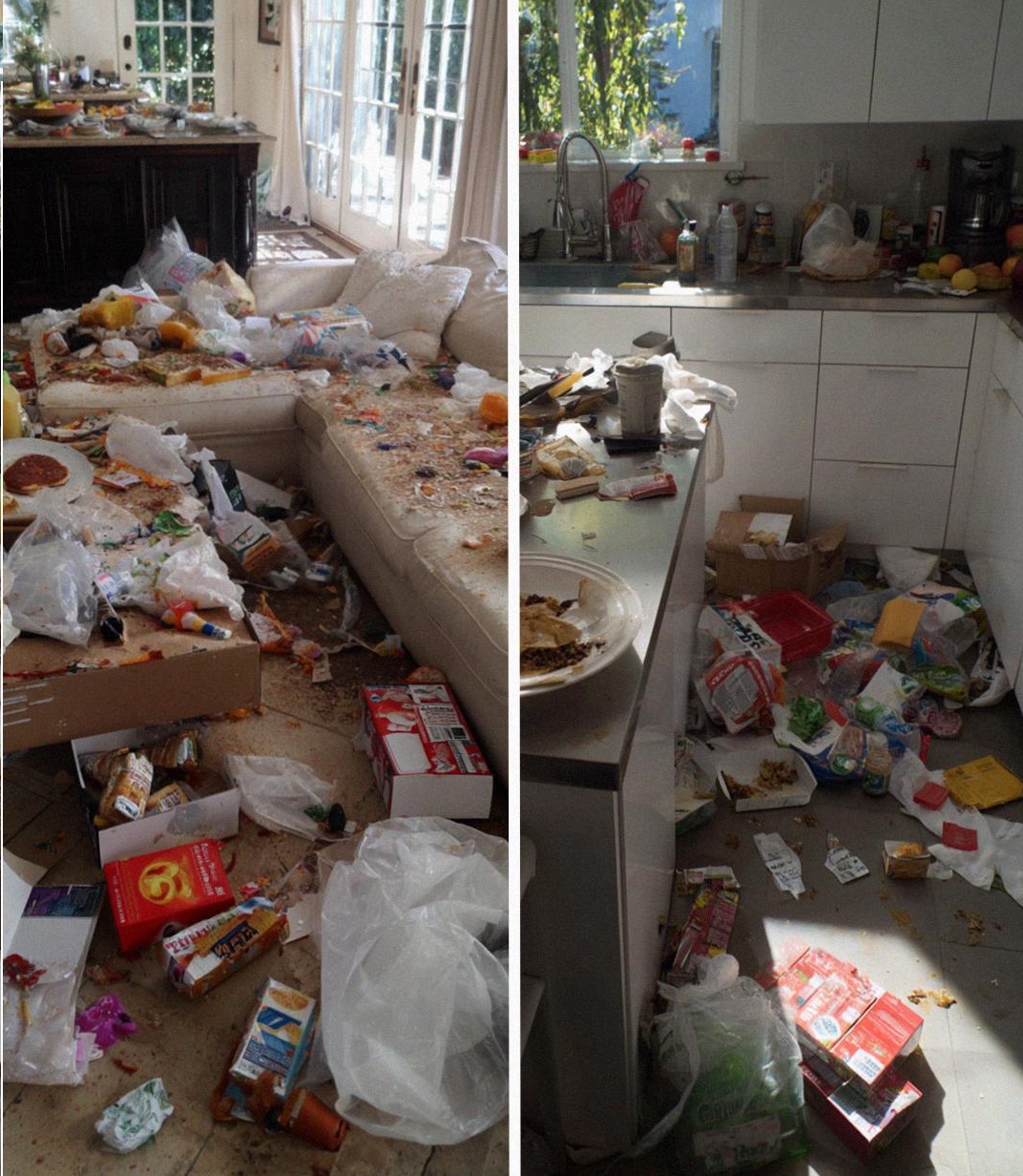 The counters were piled high with trash. There were paper plates, pizza crusts, greasy napkins, and half-empty bottles of orange soda. And of course, nothing had been bagged into trash bags. No one had even tried to clean up.